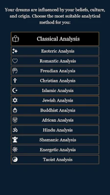 Our unique app offers you a choice of 13 different analysis methods, tailored to your culture, beliefs, and personal curiosities. Whether you are looking for a classic interpretation or an analysis influenced by spiritual and religious perspectives, Dreams Analytics is the perfect tool to explore the hidden messages of your subconscious through your dreams.