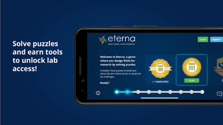 Eterna is a citizen science game where players learn to design RNA molecules for medical research by solving puzzles. Complete puzzles to unlock lab access and participate in challenges where you can invent medicine!
