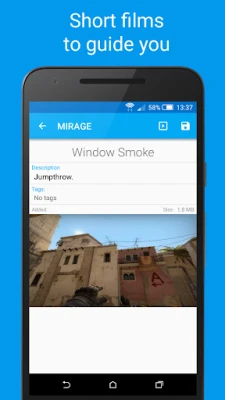 Over 1500 movies that show you different ways to throw granades for all of the most popular maps in Counter Strike, handed to you in the easiest way possible. This app allows you to easily look up smokes even when you are in the middle of game and constantly growing database of movies is automatically updated every time you start an application.