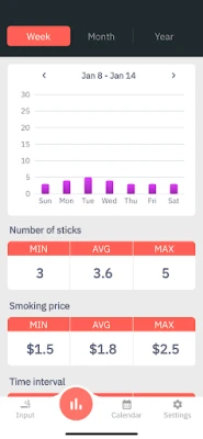 ・You can see at a glance the number of cigarettes smoked and the amount of money spent for each week, month, and year using the chart.