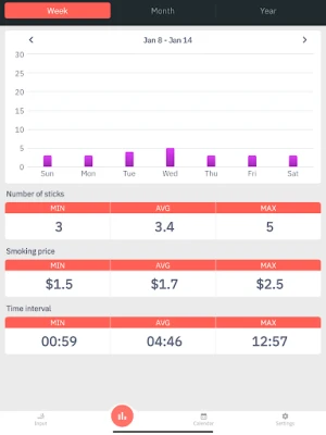 In addition, the Chart screen allows you to check the number of cigarettes smoked per week, month, and year, as well as the amount of money spent.